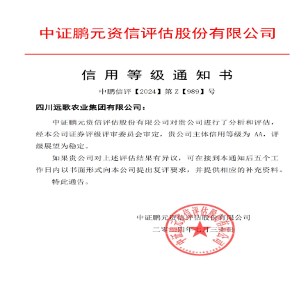 2024年7月30日,经国内权威评级机构中证鹏元资信评估公司综合分析和评估,四川远歌农业集团有限公司(以下简称"远歌农业集团")成功获评"AA"主体信用等级,评级展望为稳定。此次获评"AA"主体信用评级,对远歌农业集团高质量发展具有重要意义。
