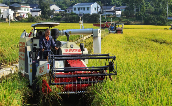 9月2日上午,随着机械轰鸣下田,四川远歌农业集团位于威远县新场镇粮油现代农业园区种植的500亩水稻开镰。经过育秧、分蘖、拔节、抽穗、扬花、灌浆,最后汇聚成一片片金黄色的稻田,沉甸甸的稻穗向人们展示着丰收的成果。